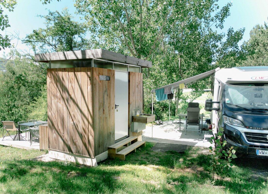 Premium-Stellplatz mit eigenem Sanitärbereich