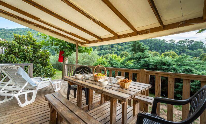 Landscaped plot. Semi-covered wooden terrace with garden furniture, including 1 table, 2 benches, and 2 deck chairs. Barbecue provided upon request.