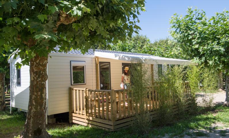 Parcela ajardinada. Terraza de madera semi cubierta con mobiliario de jardín que incluye 1 mesa, 2 bancos y 2 tumbonas.