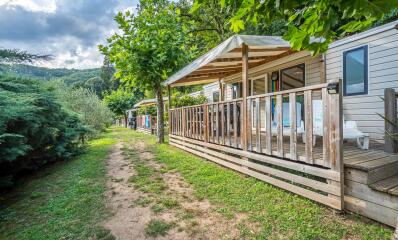 Parcelle paysagée. Terrasse en bois semi-couverte avec salon de jardin comprenant 1 table, 2 bancs et 2 transats. Barbecue fourni à la demande.