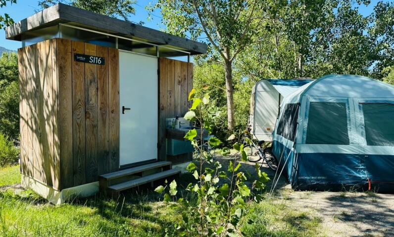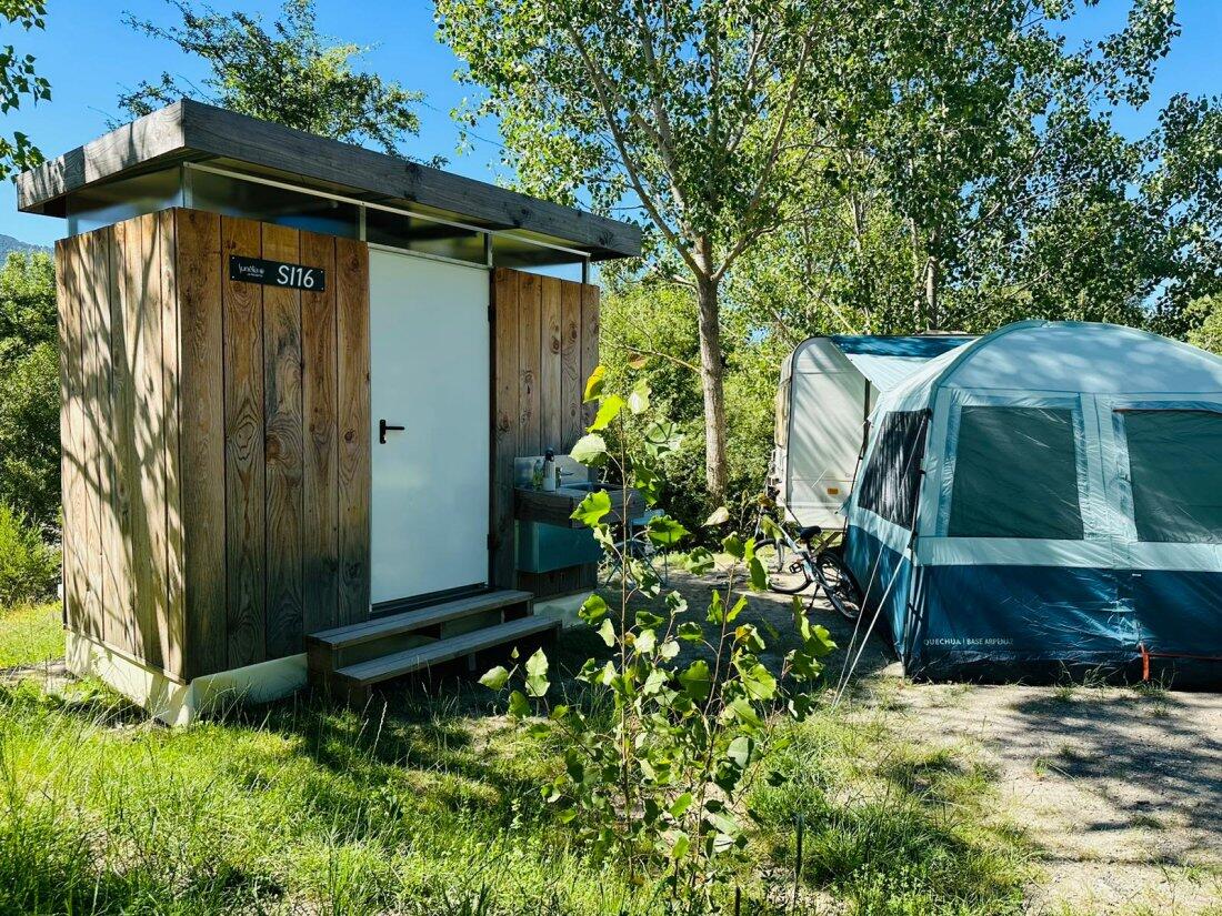 Geniet volop van uw kampeerervaring, in alle comfort en volledige privacy op deze ruime staanplaatsen (110 m²) met privé-sanitair (douche, wastafel en apart toilet)!